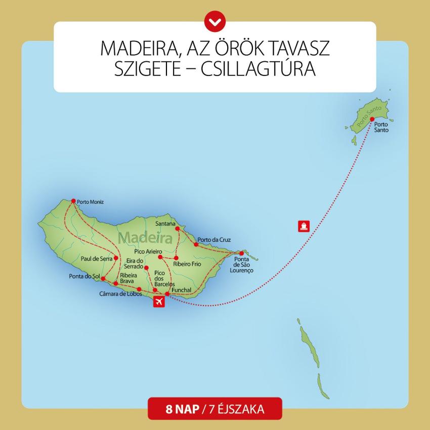 A napunknak látványos kezdést biztosít a sziget egyik legmagasabb pontja, a Pico do Arieiro, mely 1818 méter magas. Innen álomszép kilátás nyílik a környező, zöldellő lankákra, és a sejtelmes felhőkre. Tiszta időben akár a Paul de Serra fennsíkon lévő szélturbinákat is megpillanthatjuk. Majd a Ribeiro Frio völgyben a laurisilva, azaz babérerdő vár ránk. Megállunk egy kis levada túrára. A levada egy tipikus madeirai turistaútvonal, mely a növények ellátását biztosító vízcsatornák köré épült. Körülbelül 25 perces ballagás után érjük el a Balcões kilátópontot. A buszunkhoz visszafelé egy újabb, kb. 20 perces gyaloglás vezet. Majd Santana varázsol el minket jellegzetes, háromszöget formázó kis faházaival. Majd elhaladunk Porto da Cruz, illetve a sziget jelképének számító Sas-szikla, azaz Penha d'Águia mellett. Kihagyhatatlan élményt ígér a rumfőzde Engenhos do Norte-nál. A nap méltó zárását jelenti Ponta de São Lourenço, Madeira legkeletibb pontja, ahonnan elénk tárul az északi és a déli part is. Visszatérés a hotelbe.